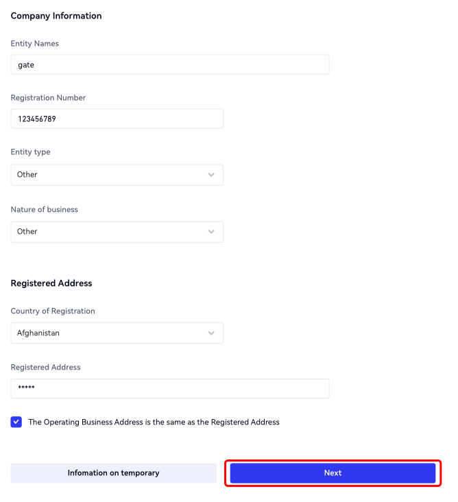 2.Na página "Informações da Empresa", preencha os campos obrigatórios, incluindo nome da entidade, número de registro, tipo de entidade, natureza do negócio, país de registro e endereço registrado. Depois, clique em "Próximo" ou "Informação temporária".