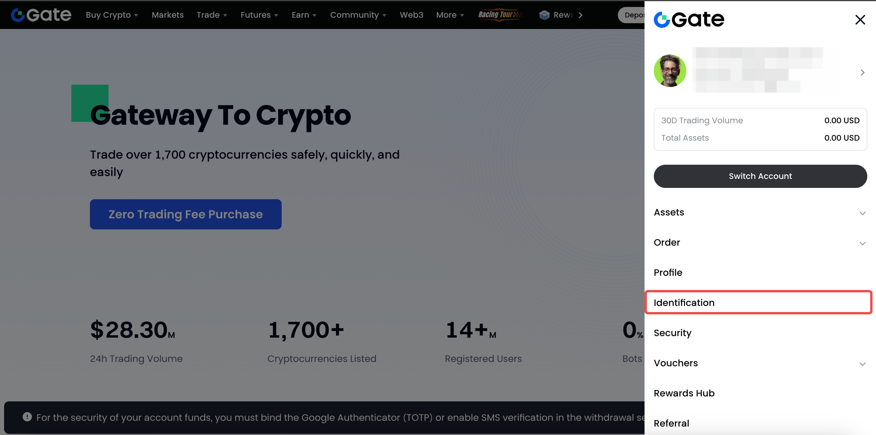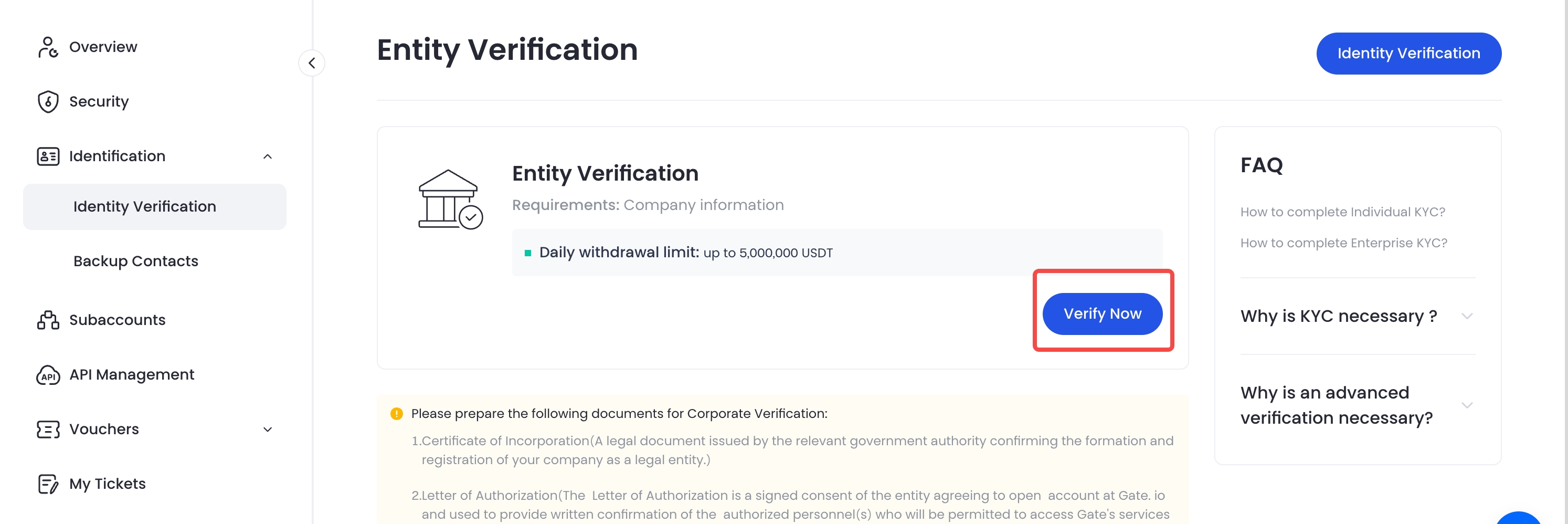 1.Faça login na sua conta da Gate e clique no ícone do perfil no canto superior direito. Em seguida, clique em "KYC (Identificação)" - "Verificação Empresarial" - "Verificar Agora".