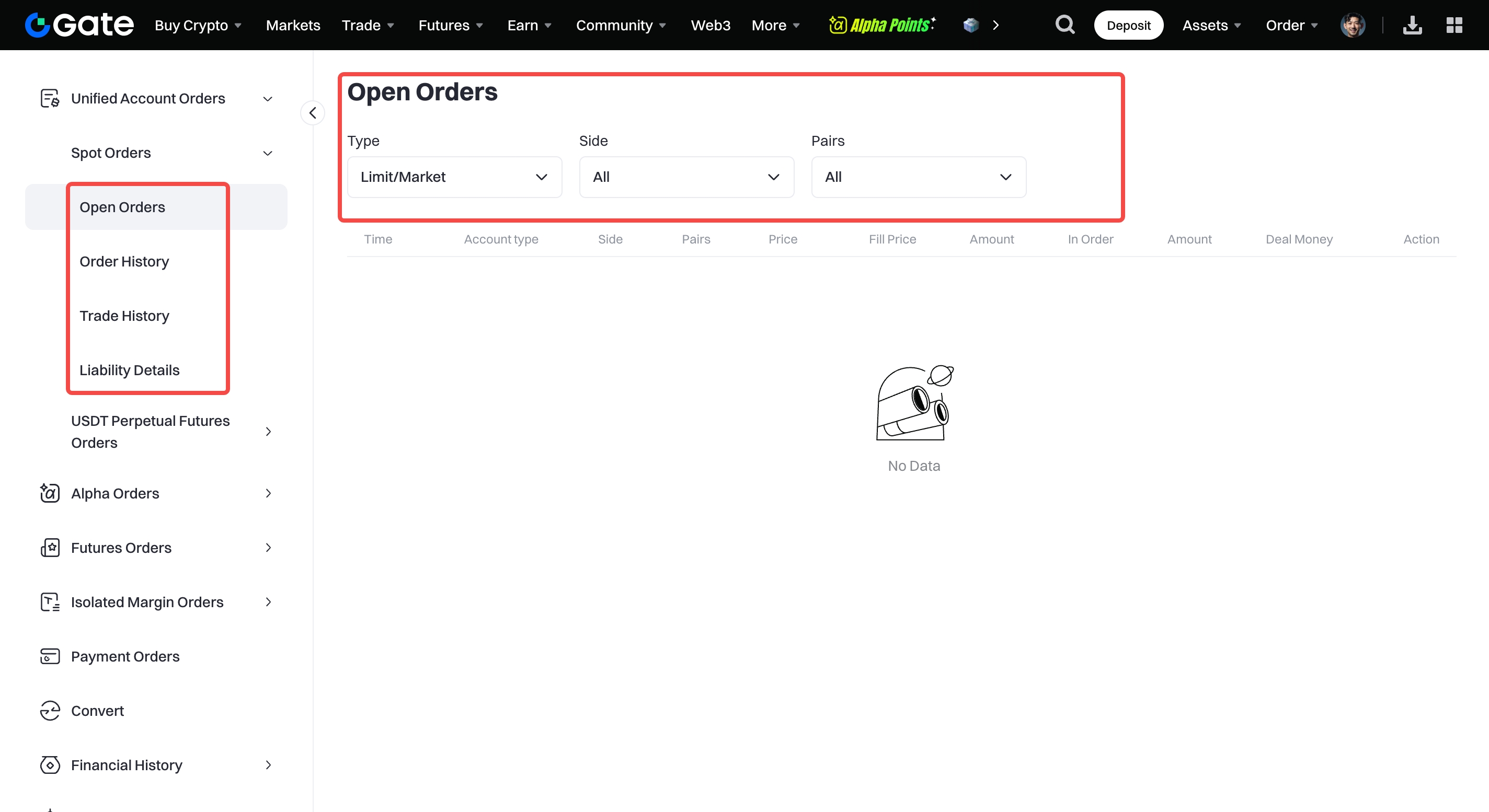 Passo 1: Faça login na sua conta Gate. Clique em [Pedidos] - [Pedidos Spot].
