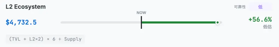 Semelhante ao primeiro modelo de avaliação, este modelo adiciona todo o TVL de L2 e, devido ao consumo de L2 para o Ethereum, dá um peso de 2x. O método de cálculo é (TVL + L2_TVL×2) × 6 ÷ Supply, resultando em um preço de 4732,5, o que representa um espaço de valorização de 56,6% em relação ao preço atual.