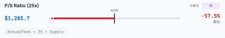 No Ethereum, a relação preço-vendas refere-se à relação entre o valor de mercado e a receita anual de taxas de transação. Como as taxas eventualmente vão para os validadores, não existe o conceito de relação preço-lucro na rede. A Token Terminal utiliza esse método para avaliação, com 25 vezes sendo o nível de avaliação para ações de tecnologia em crescimento, e a Hashed chama isso de “padrão da indústria para avaliação de protocolos L1”. A fórmula de cálculo desse modelo é Annual_Fees × 25 ÷ Supply, resultando em um preço de 1285,7 dólares, o que representa um espaço de queda de 57,5% em relação ao preço atual.