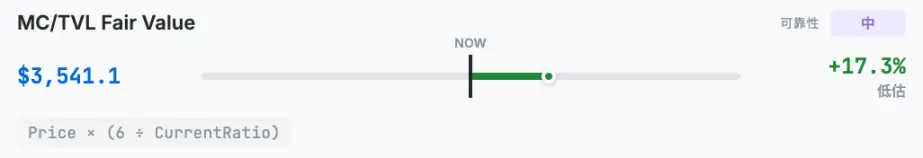 Este modelo é essencialmente um modelo de regressão à média, cujo cálculo considera o nível médio histórico da razão entre a capitalização de mercado e o TVL como 6 vezes. Se ultrapassar, é considerado sobrevalorizado; se não, subvalorizado. A fórmula é Preço × (6 ÷ Razão Atual), resultando em um preço de 3541,1 dólares, com um potencial de subida de 17,3% em relação ao preço atual.
