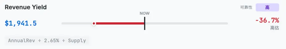O único modelo de avaliação com alta confiabilidade entre todos os modelos de avaliação, Hashed afirma que este modelo é apreciado pelos analistas da TradFi que avaliam criptomoedas como uma classe de ativos alternativos, que avalia o Ethereum como um título de renda. O método de cálculo é dividir a receita anual do Ethereum pela taxa de rendimento de staking para calcular a capitalização de mercado total, a fórmula é Receita_Anual ÷ APR ÷ Fornecimento, resultando em 1941,5 dólares, o que representa um espaço de queda de 36,7% em relação ao preço atual.
