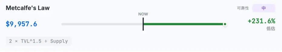 Hashed indica que este modelo foi validado empiricamente por pesquisadores acadêmicos (Alabi 2017, Peterson 2018) em relação ao Bitcoin e ao Ethereum. Aqui, o TVL é utilizado como um indicador proxy da atividade da rede. A fórmula de cálculo é 2 × (TVL/1B)^1.5 × 1B ÷ Supply, resultando em um preço de 9957.6 dólares, com um potencial de aumento de 231.6% em relação ao preço atual.