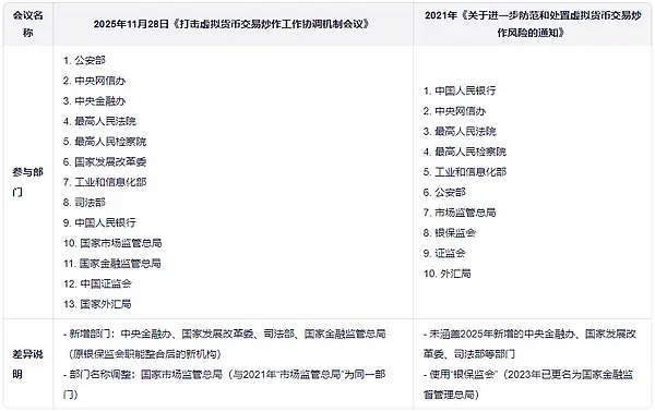 Comparando as ações regulatórias de 2021 e 2025, a diferença mais evidente é o aumento do número de departamentos participantes. A “Notificação” de 2021 foi emitida em conjunto por dez departamentos, incluindo o Banco Popular da China, enquanto a reunião de 2025 se expandiu para incluir representantes de treze departamentos, como o Ministério da Segurança Pública, Administração do Ciberespaço da China, Escritório Central de Finanças e Desenvolvimento, Comissão Nacional de Desenvolvimento e Reforma.
