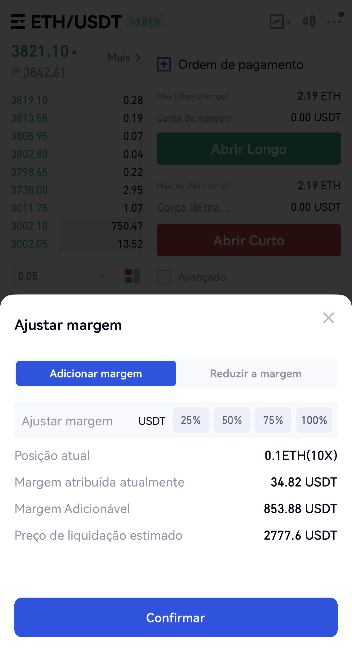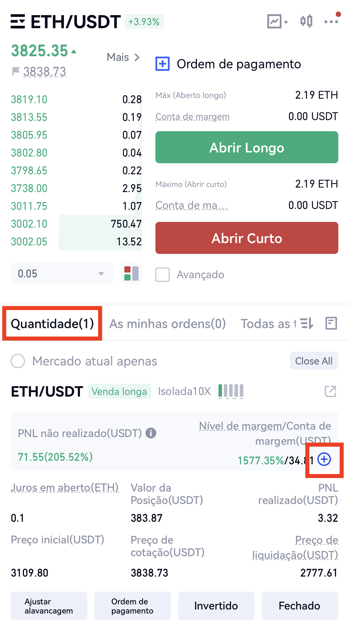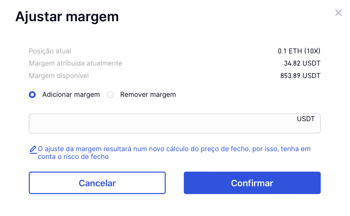 Você pode clicar em “Ajustar margem” no canto inferior esquerdo da “Posição” da página de negociação de futuros e inserir o valor da margem aumentada ou diminuída.