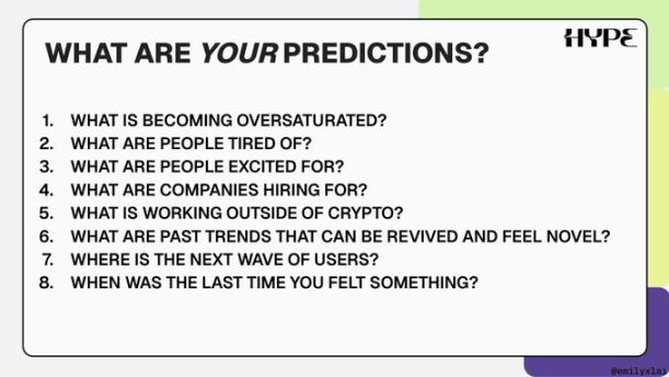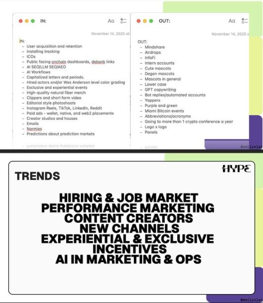 Segue uma lista subjetiva e não exaustiva do que está em destaque e do que está a desaparecer, de acordo com insights meus, de VCs cripto, marketers e da comunidade Crypto Twitter.