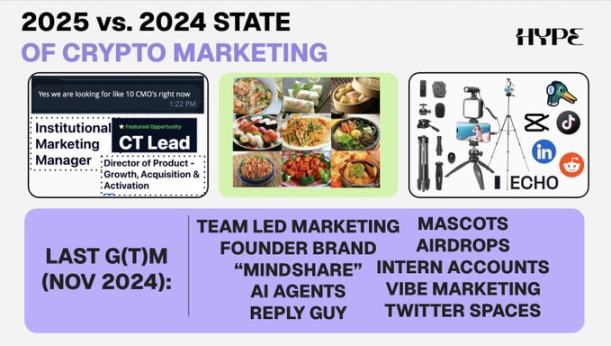 Em 2024, as principais tendências foram campanhas lideradas por equipas, branding de fundadores, agentes de IA, “reply experts”, mascotes, airdrops, contas de estagiários e o conceito “mindshare” lançado pela InfoFi.