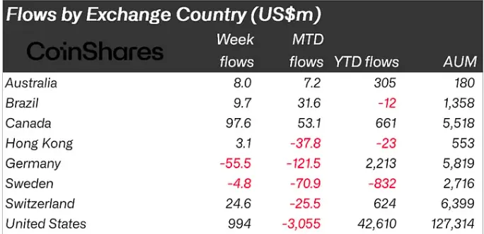 Apesar do feriado de Ação de Graças, os Estados Unidos tiveram entradas totalizando US$ 994 milhões na semana passada, com entradas significativas do Canadá (US$ 97,6 milhões) e da Suíça (US$ 23,6 milhões). Por outro lado, a Alemanha foi um dos poucos países a registrar saídas, totalizando US$ 57,3 milhões.
