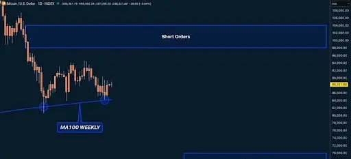 Assim, foram abertas posições longas em torno do Valor da Área Baixa entre $80,000 e $84,000 em um rebote que poderia evoluir mais tarde para uma armadilha de touros. Pouco depois, o Bitcoin caiu e retestou com sucesso o nível de $84,000, que está alinhado com a MA100 semanal, após vários movimentos enganosos para cima.
