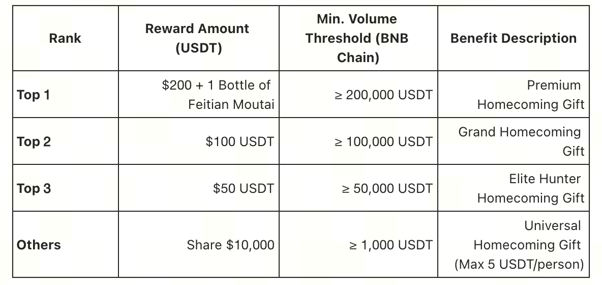 Примечание: Если победитель не достиг порога торгового объема для своего ранга, будет применен механизм понижения уровня. Приз Feitian Moutai может быть обменян на денежный эквивалент в размере 490 USDT, который будет отправлен на адрес Web3-кошелька.