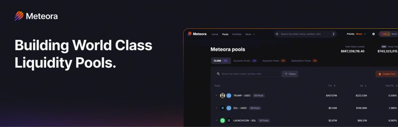 Meteora — это комплексный DeFi-протокол на базе Solana. Вместо обычной децентрализованной биржи Meteora выступает главным механизмом ликвидности для всей экосистемы. Благодаря высокоэффективным и гибко настраиваемым инструментам управления ликвидностью Meteora позволяет трейдерам, проектным командам и поставщикам ликвидности обеспечивать оптимальное распределение капитала на быстро меняющихся рынках.