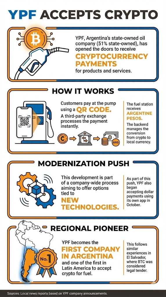 YPF стала первой компанией в Аргентине и одной из первых в Латинской Америке, которая начала принимать криптовалютные платежи за топливо, следуя аналогичному опыту в Сальвадоре, где биткойн был признан законным платежным средством.