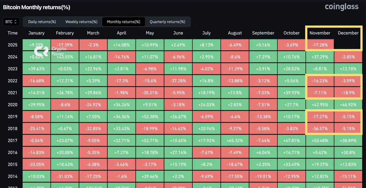 Таблица сезонности Coinglass показывает мощный паттерн. Каждый раз, когда ноябрь закрывается в красном, декабрь очень часто также оказывается красным. Ноябрь 2025 года завершился с -17,28%, что совпадает с несколькими прошлыми циклами, когда красный ноябрь сопровождался красным декабрем, включая 2018, 2019 и 2022 годы.