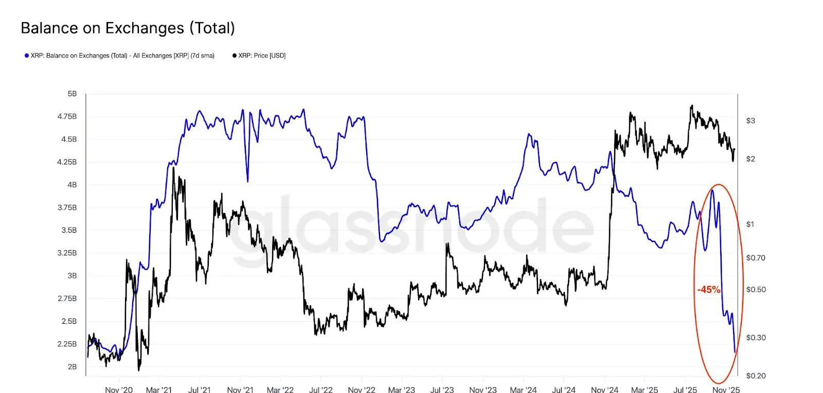Тем временем XRP, доступный на биржах, продолжает резко сокращаться, что свидетельствует о снижении давления на продажу. Общее количество XRP, хранящихся на всех биржах, упало с 3,95 миллиарда 21 сентября до всего лишь 2,6 миллиарда к 27 ноября — снижение на 45% в доступной ликвидности.