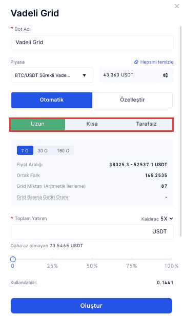Long, short ve nötr grid, kullanıcılara daha geniş bir seçim alanı ve daha esnek karlar sağlar. Deneyimli ve olgun trade becerilerine sahip kullanıcılar, öznel yargılarla piyasanın yönünü tahmin edebilirler. Bir yükseliş öngörürlerse, uzun gitmeyi seçebilirler, aksi takdirde kısa gitmeyi seçebilirler. Nispeten deneyimsiz olan veya piyasa tahmini ve muhakemesinde zorluk yaşayanlar tarafsız bir grid seçebilirler. Bu şekilde, sonraki fiyat yükselse de düşse de kâr etmek mümkündür.