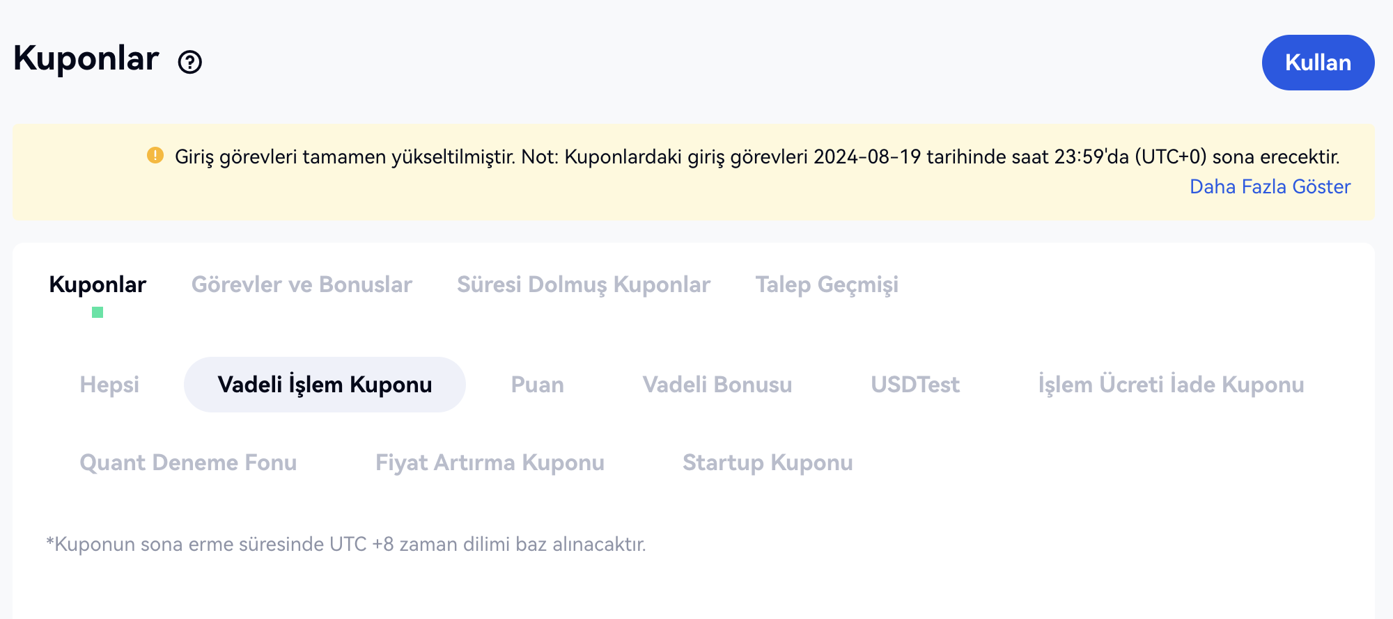 Vadeli işlem kuponu yalnızca Vadeli İşlem Kuponu Modunda vadeli işlem ticareti için kullanılabilir.