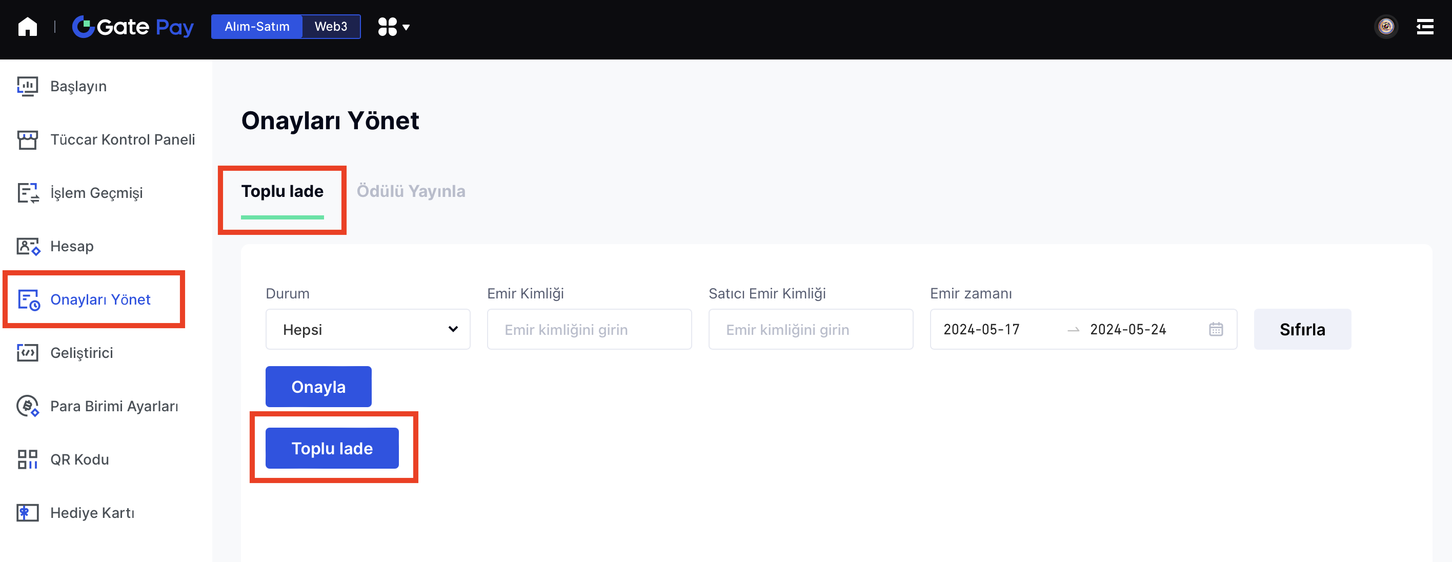 Tüccarlar, tam bir iade işlemek için 【Sipariş Kimliği】 veya 【Tüccar Sipariş Kimliği】'ni onaylamalıdır, bu işlemi ticaret yönetim sistemimizdeki 【Toplu İade】 ile yapabilirler.