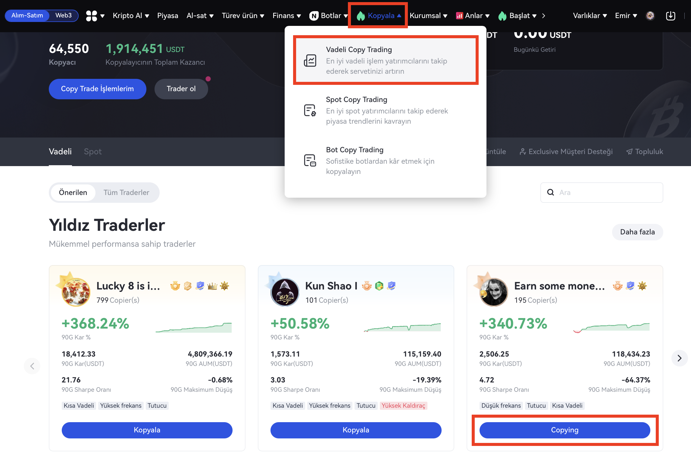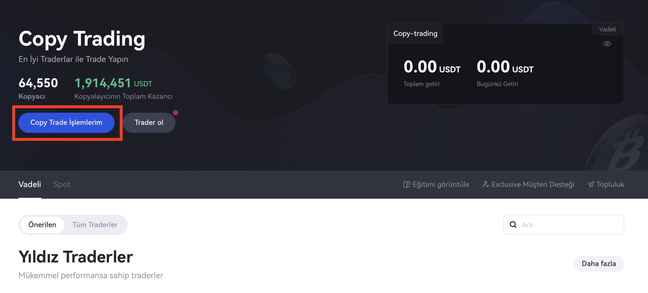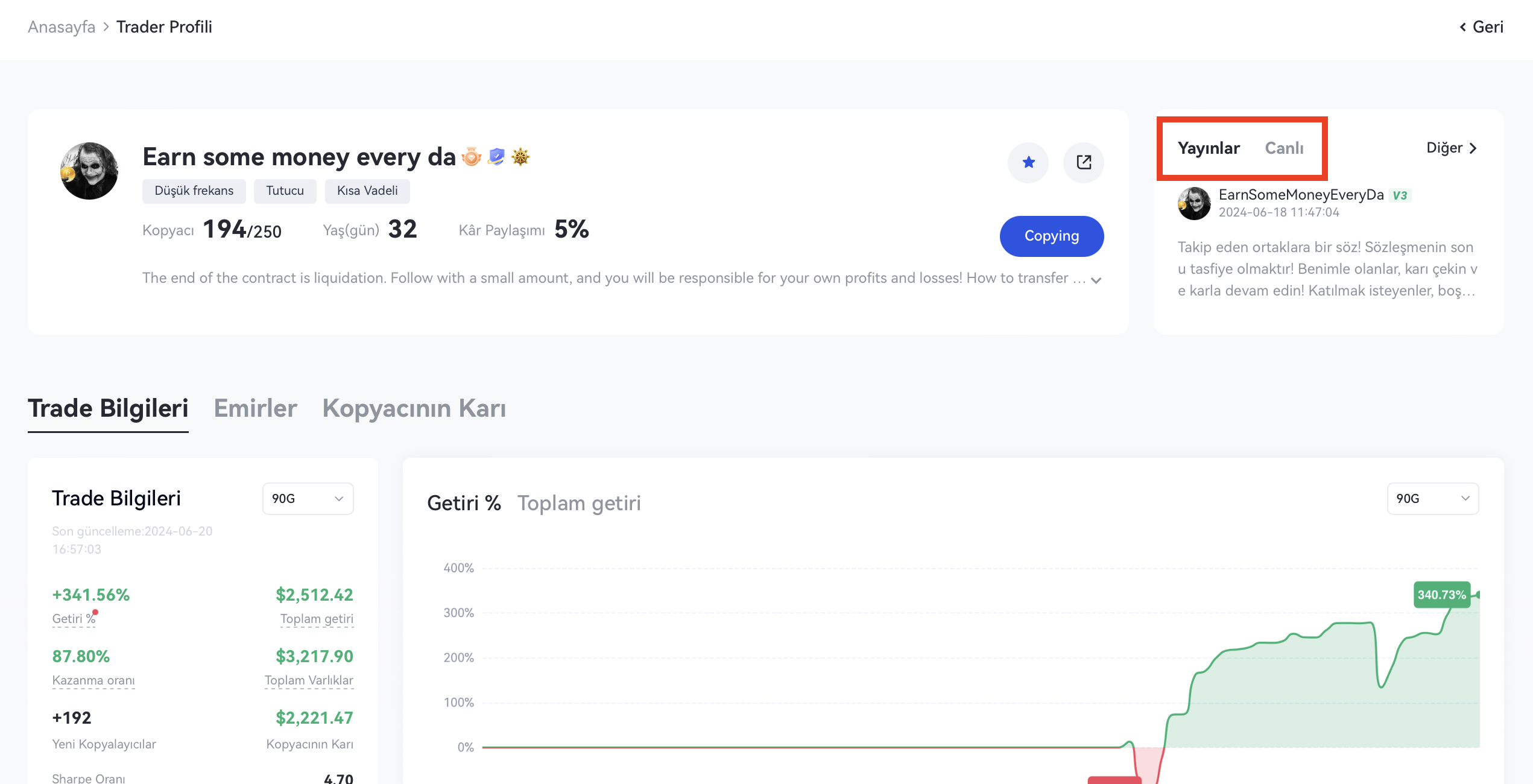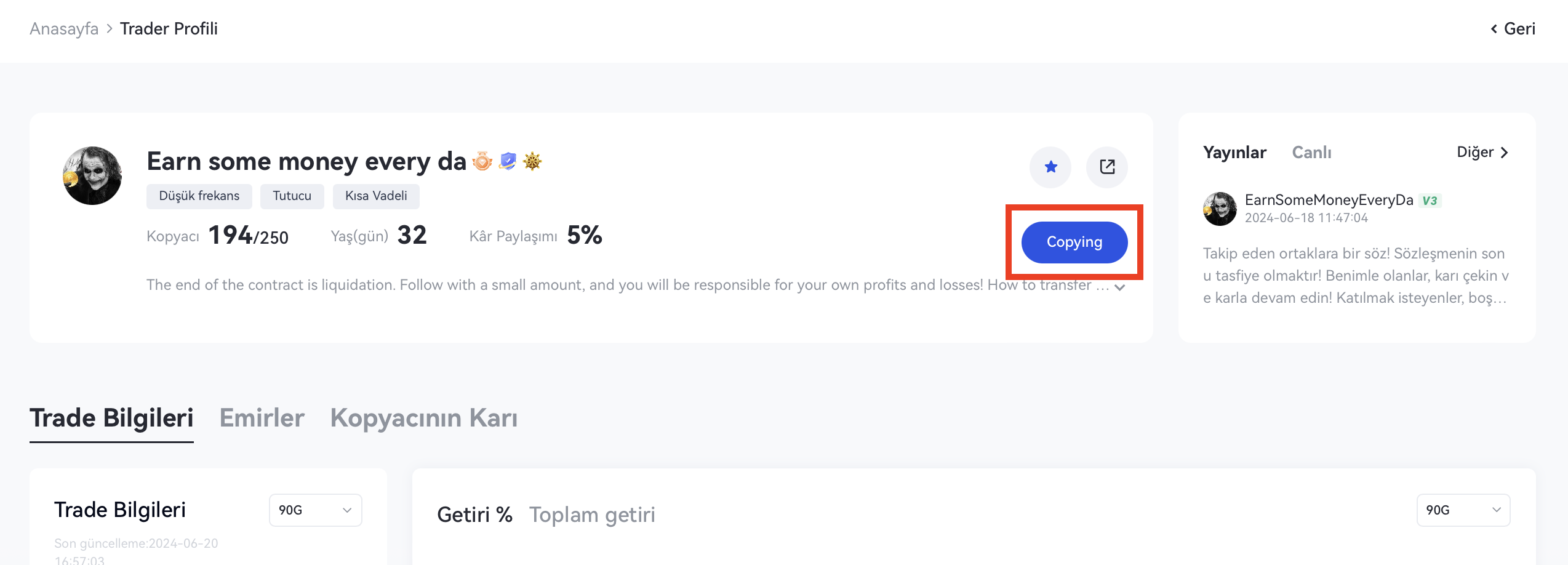 İpuçları: Lider tüccarlar için, kendilerini Gönderilerde ve Canlı akışta aktif olarak göstermek, bilgileri senkronize etmeye ve kopyalayıcılarla kişisel olarak karşılaşmaya elverişlidir; bu, aynı zamanda birbirleriyle güven oluşturmanın yollarından biridir.