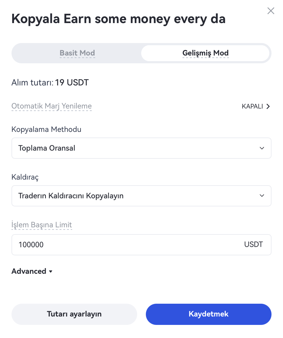 Kopyalama sürecinde, kopyalayıcının takip ettiği lider tüccar bir pozisyon açtıysa, kopyalamanın sürdürülebilirliğini sağlamak için kopyalayıcı marjı tamamlayabilir. Marjı tamamlamak için spot hesabın kullanılabilir bakiyesini veya cari kopya hesabı kullanabilirsiniz.