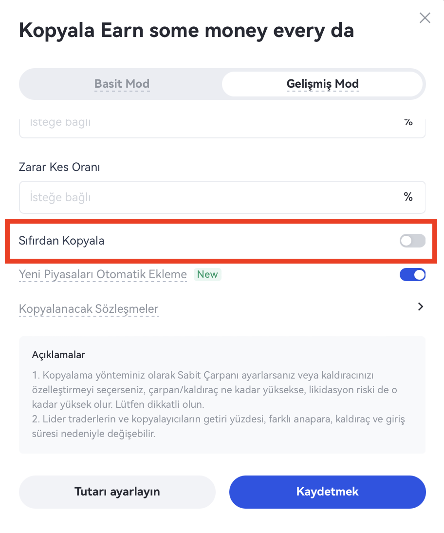 İpuçları: Kopyalayıcının yatırım getirisinin lider tüccarın yatırım getirisine yakın olmasını sağlamaya çalışmak için, kopyalayıcının "öncü tüccarın pozisyonu olmadığında kopyalamaya başla" seçeneğini seçmesi daha iyi olur.