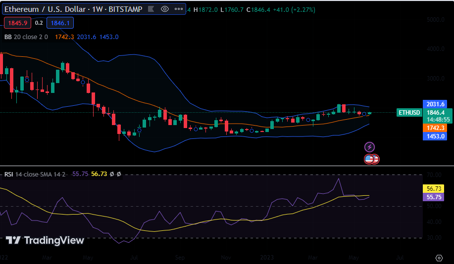 Ethereum (ETH), has also made progress over the week as its weekly gain stands at 1.72%, dominating the bull activity on the network increases. Trading at $1845 as of press time, Ethereum indicators indicate reduced volatility on the asset’s network as the Bollinger bands move close to each other. The relative strength indicator is also moving close to its average line as bulls drive for a shift above the line, indicating a likely bullish trend on ETH.