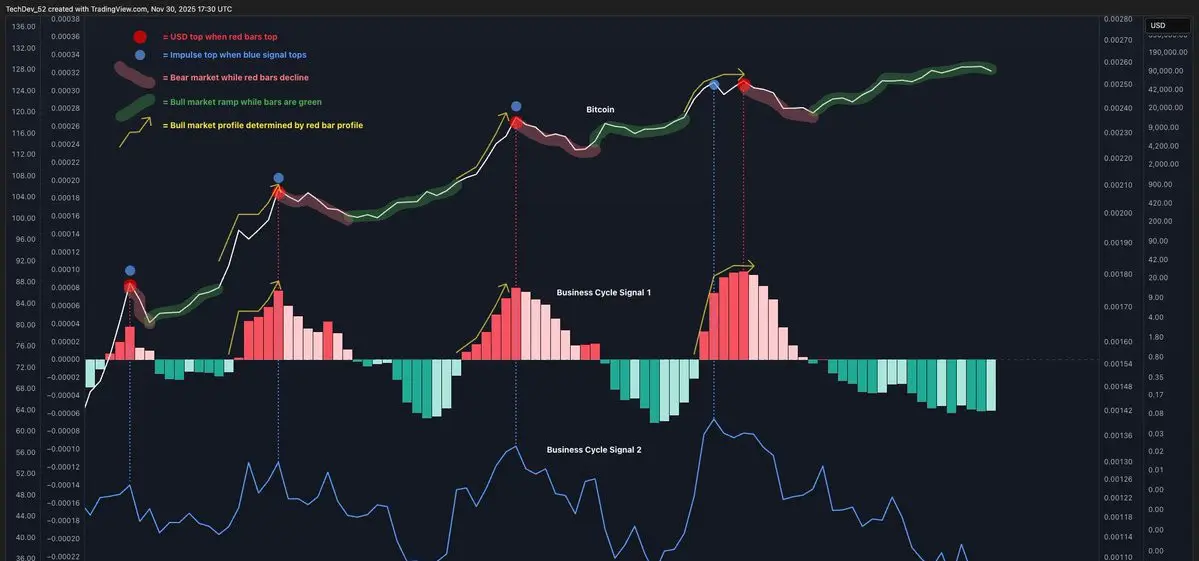 TechDev’s research focuses on two business-cycle-style oscillators. He argues that together they have captured the full rhythm of Bitcoin’s market behavior.