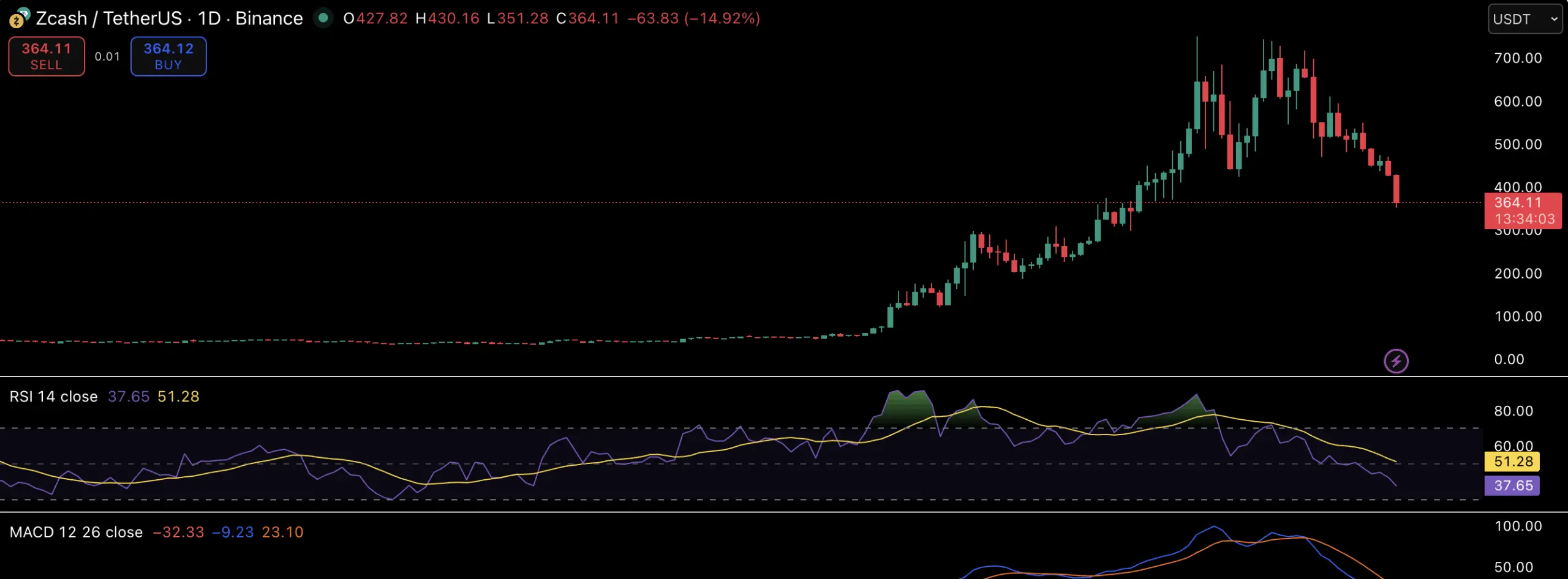The privacy-focused cryptocurrency is now trading near $364, marking a drop of more than 50% in just three weeks and one of the steepest corrections among major altcoins this quarter.