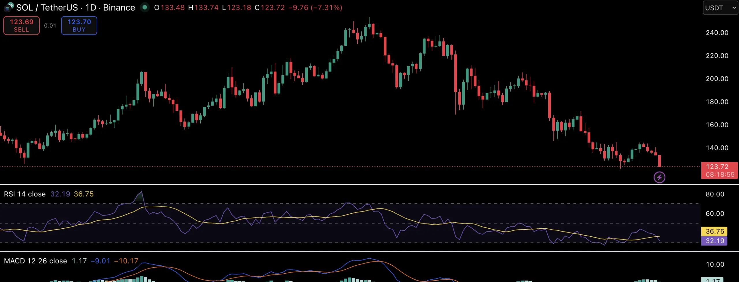After dropping more than 10% in the last 24 hours to roughly $123, SOL is hovering near a key support level where buyers previously defended the trend. Technical signals now point to a critical make-or-break zone that could dictate the next major move.