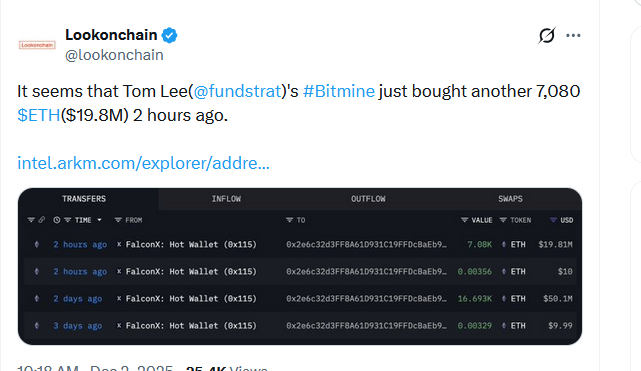 According to crypto data analytics platform data, Bitmine purchased 7,080 Ether (ETH) for approximately $19.8 million on Monday.