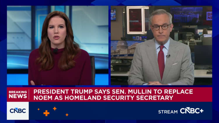 President Donald Trump on Thursday said Homeland Security Secretary Kristi Noem is leaving her post, and that she would be replaced by Sen. Markwayne Mullin, an Oklahoma Republican.
