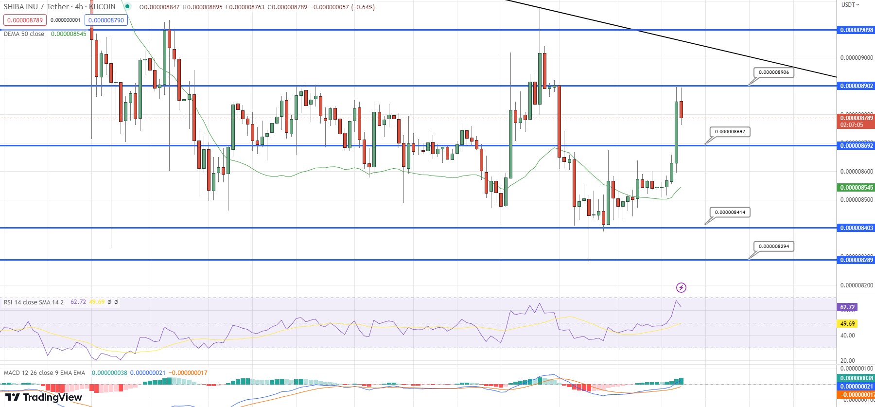 Shiba Inu Price Chart - Source: TradingviewMoreover, the 50-day exponential moving average on the hourly timeframe provides support around the level of 0.00008500, and the closing of candles above this level indicates significant upside potential for Shiba Inu
