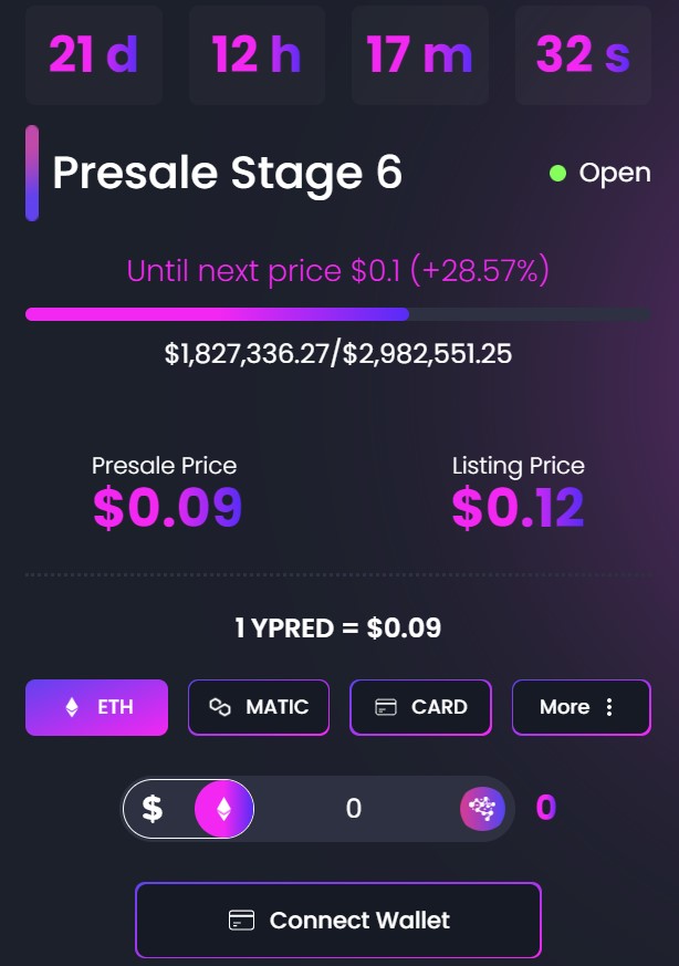 The platform’s $YPRED token is currently available for purchase at a discounted rate in its presale, with the potential for gains when it lists on major exchanges