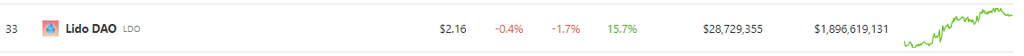 CoinGecko reports that currently, the price of Lido’s native token, LDO, stands at $2.16. While there has been a slight decline of 1.7% in the past 24 hours, the token has experienced a solid 15.7% increase in value during the last seven days.