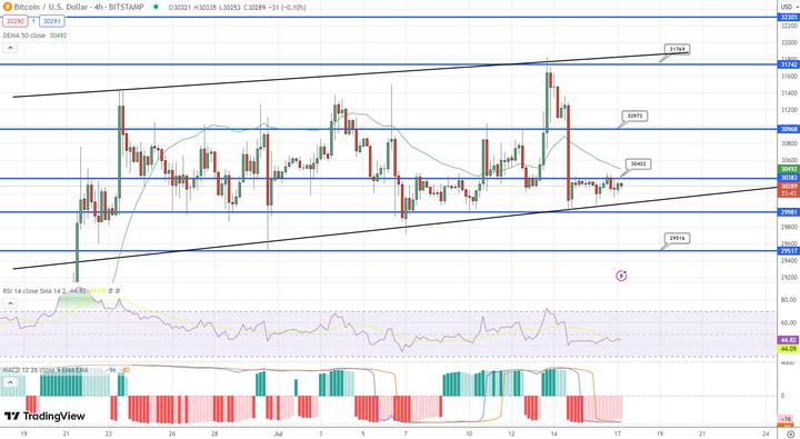 From a technical perspective, Bitcoin has found immediate support at the psychologically significant $30,000 level, which has been validated by the presence of doji and spinning top candle patterns