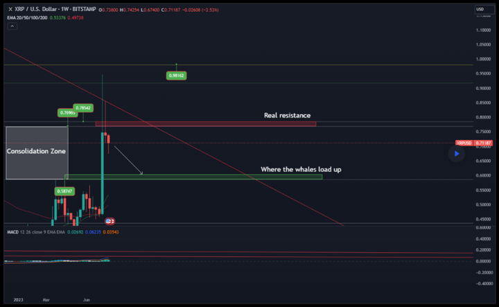 In the quest for a price rebound, Juicyho highlighted crucial resistance levels to watch: $0.769, $0.785, and $0.98, with $0.785 as the most critical resistance level, based on historical price action on the yearly time frame.