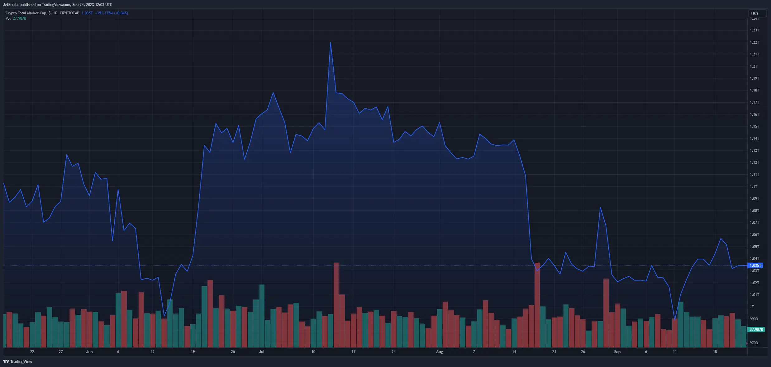 The market cap of cryptocurrencies is currently at $1.03 trillion. Chart: TradingView.com