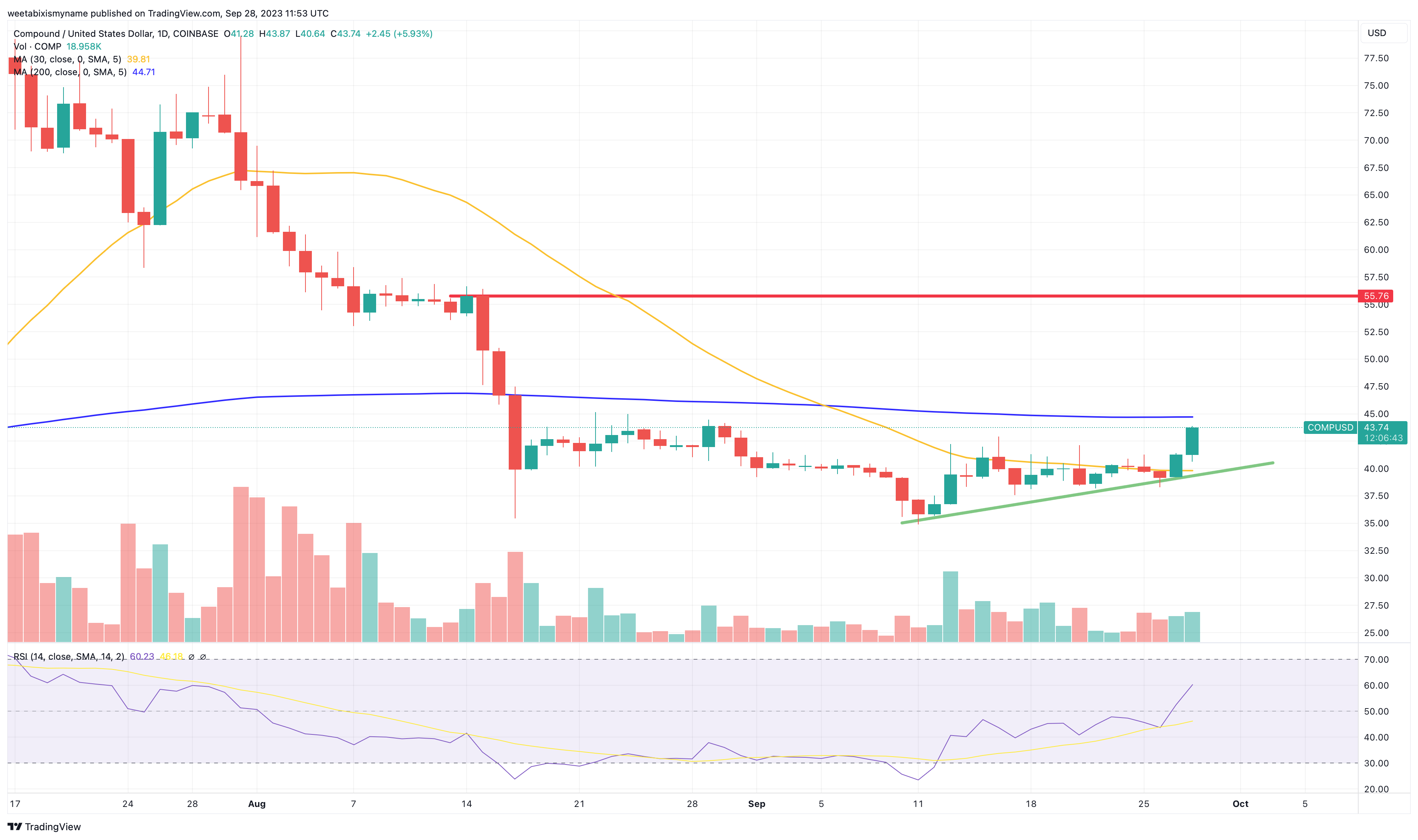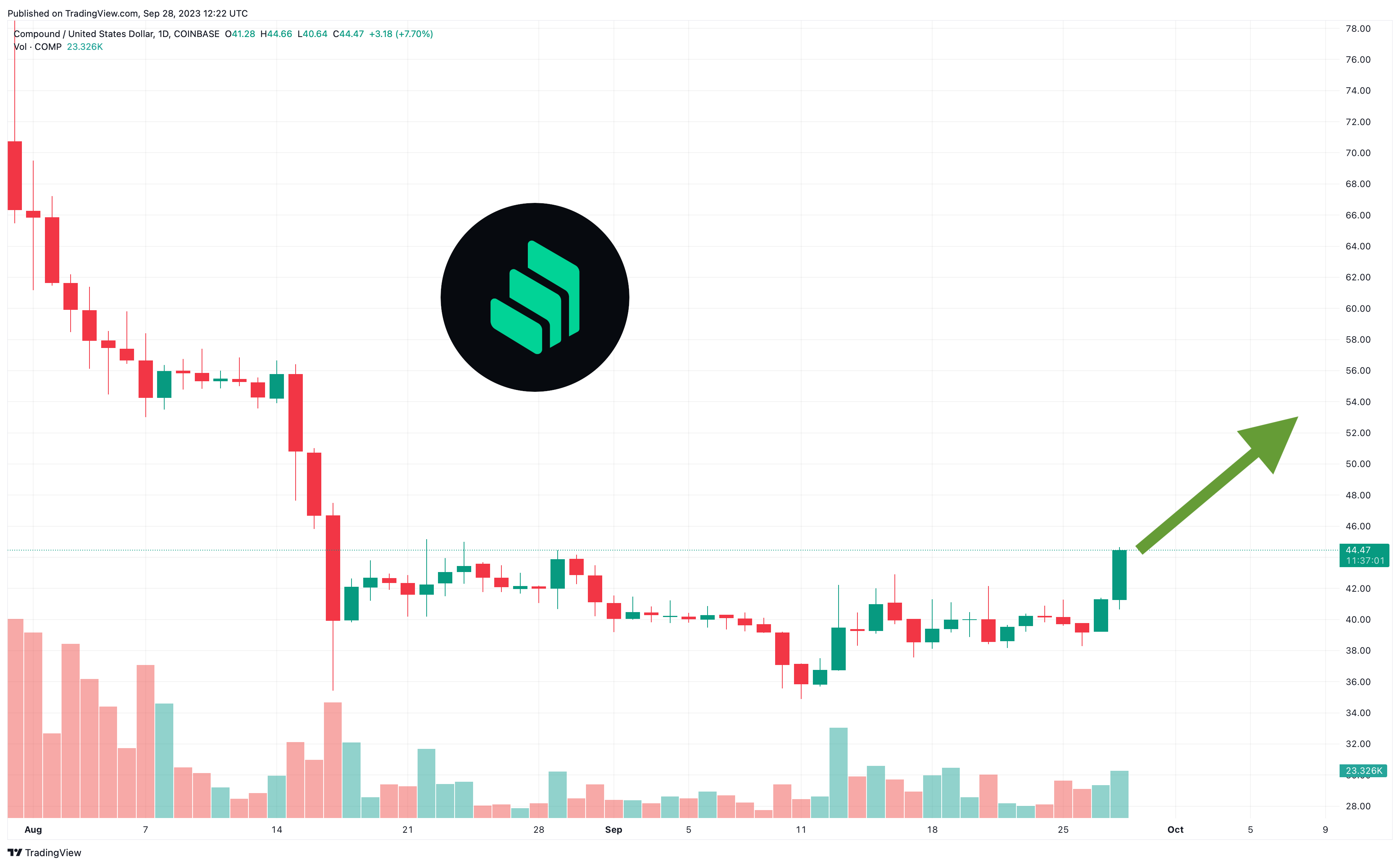 Source: TradingViewThe price of Compound (COMP) has rallied strongly this morning, with the altcoin’s ascent to $43.51 representing a 7.5% gain in the past 24 hours
