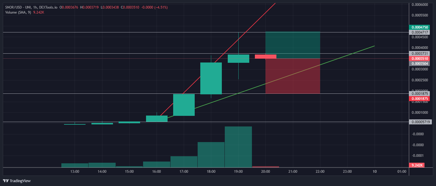 While short-time frame risk could see SNOR fall back down to $0.0001875 (a possible -46.49%).