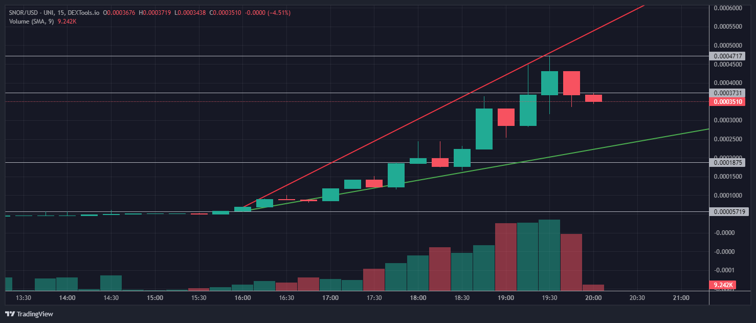 Price action shifted into moon-shot form, as SNOR crypto price surged +440% to hit an all-time high at $0.000475.