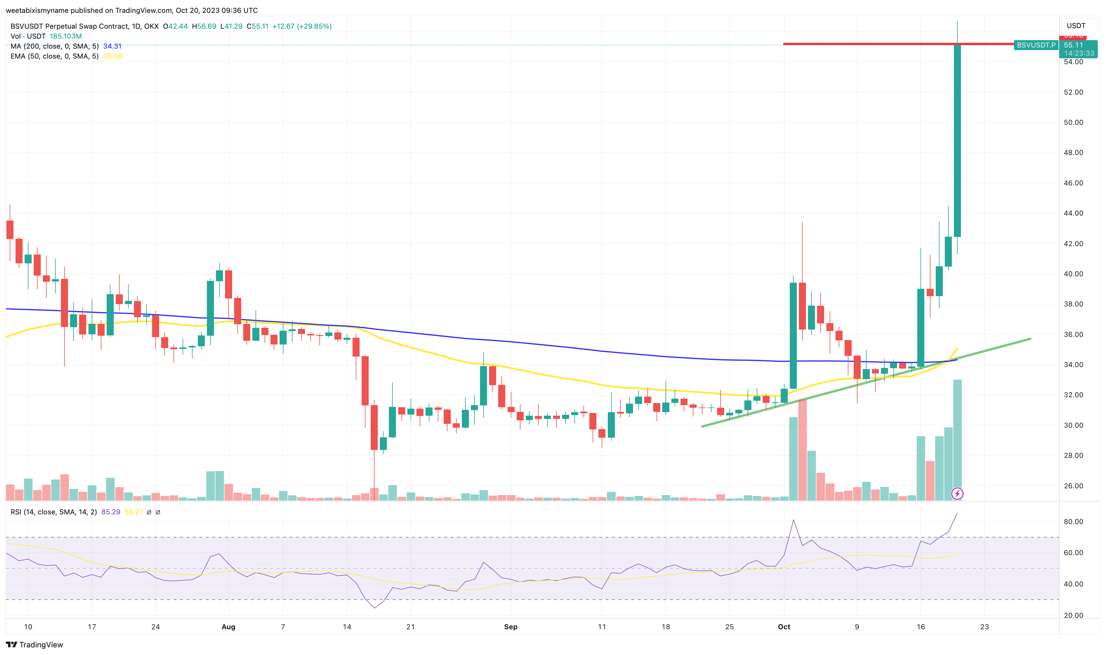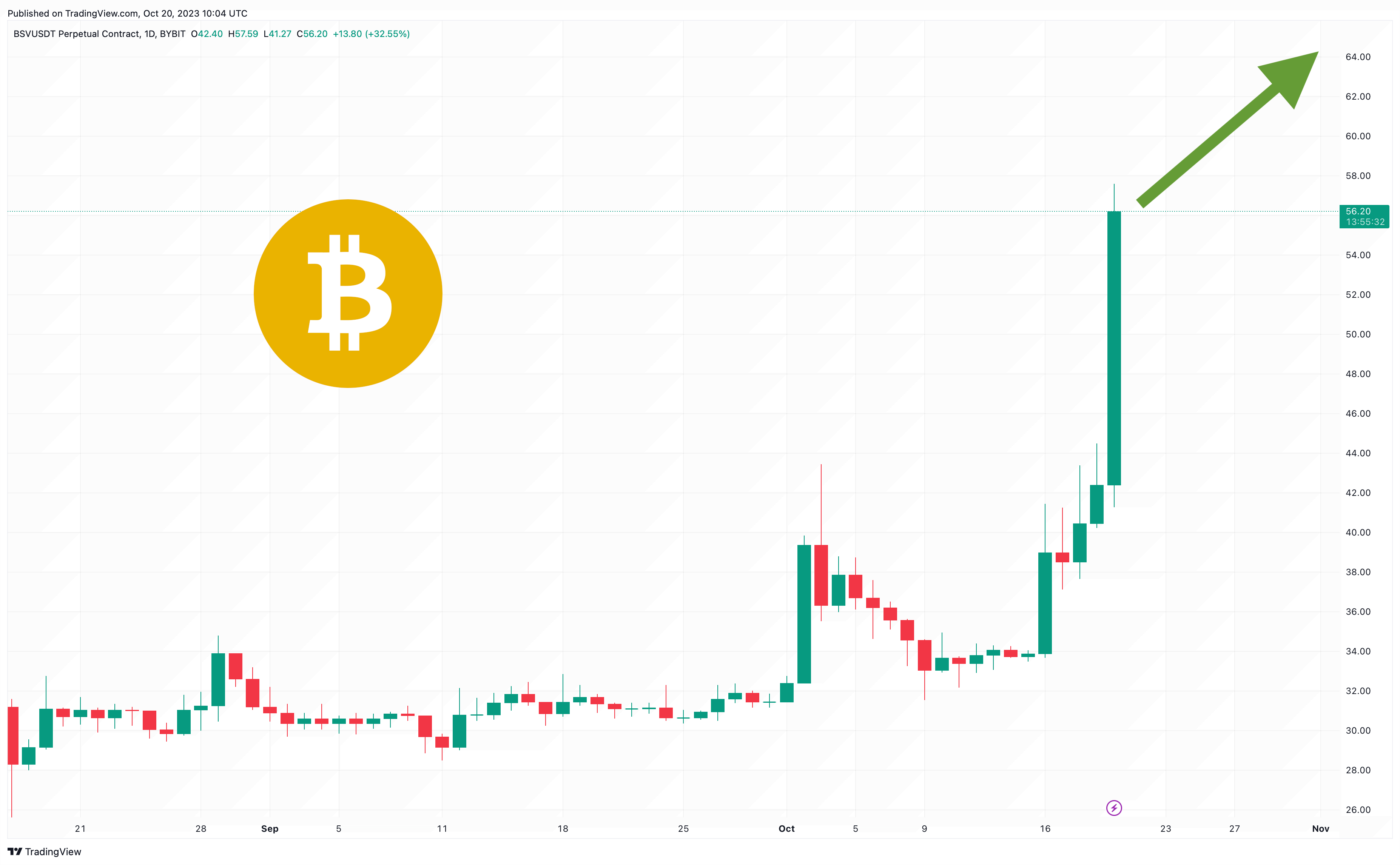 Source: TradingViewThe price of Bitcoin SV (BSV) has rallied by a massive 30% in the past 24 hours, reaching $55.46 on a day when the cryptocurrency market as a whole has risen by 4%.