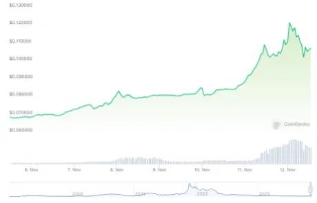 This could lead to a potential retracement or consolidation in the near future. However, in the short term, the cryptocurrency exhibits a robust bullish trend, as indicated by the 50-day Exponential Moving Average positioned at $0.0630, with the current trading price of approximately $0.1033 surpassing previous resistance levels.