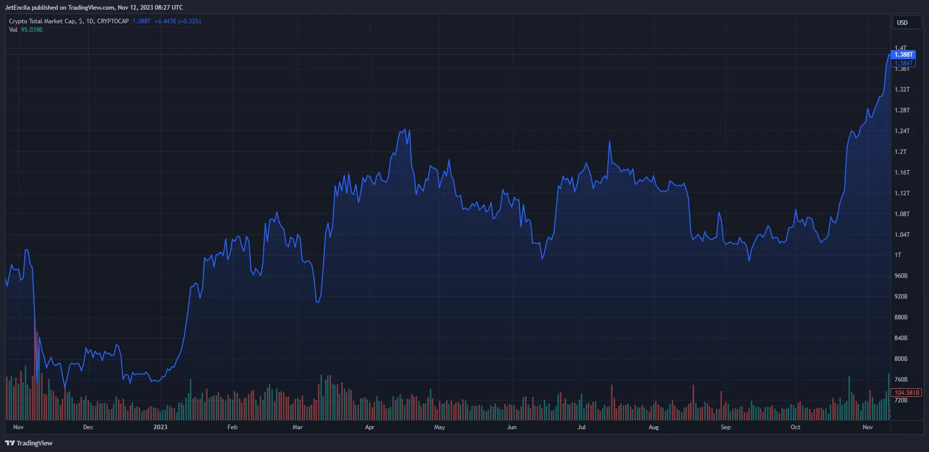 Total crypto market cap currently at $1.38 trillion. Chart: TradingView.com