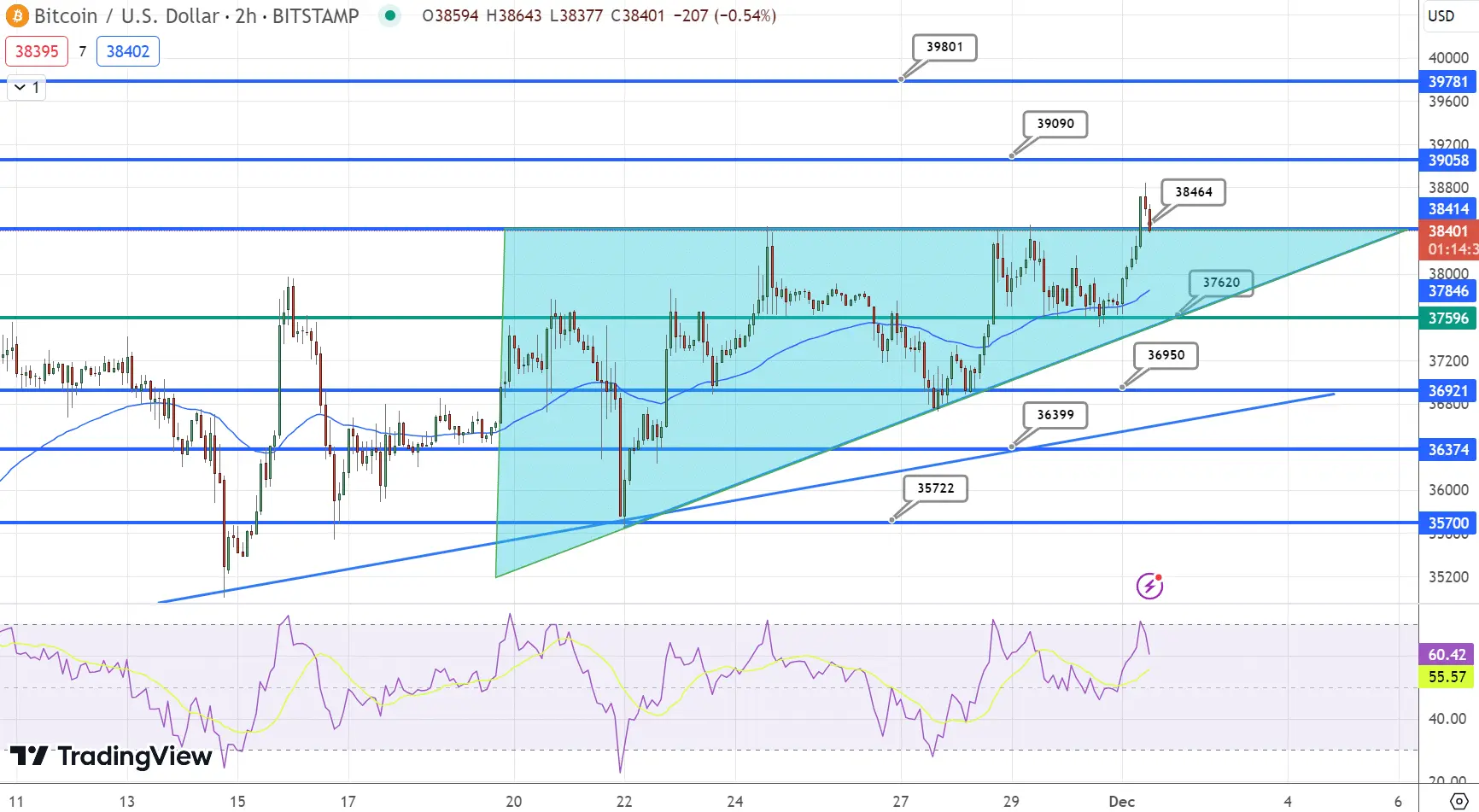 As the market opens on December 1, Bitcoin‘s current position reflects a market in contemplation. Trading at $38,150, the foremost cryptocurrency registers a slight uptick of 0.50%. This minor gain occurs within a broader context, where Bitcoin, while well off its historic highs, still navigates the complexities of market sentiment and regulatory landscapes. The 2-hour chart reveals an upward trend, with Bitcoin recently breaking through the $38,400 resistance level. The pivot point for the session stands firm at $38,402, indicating a battleground where bulls and bears are testing their strength.