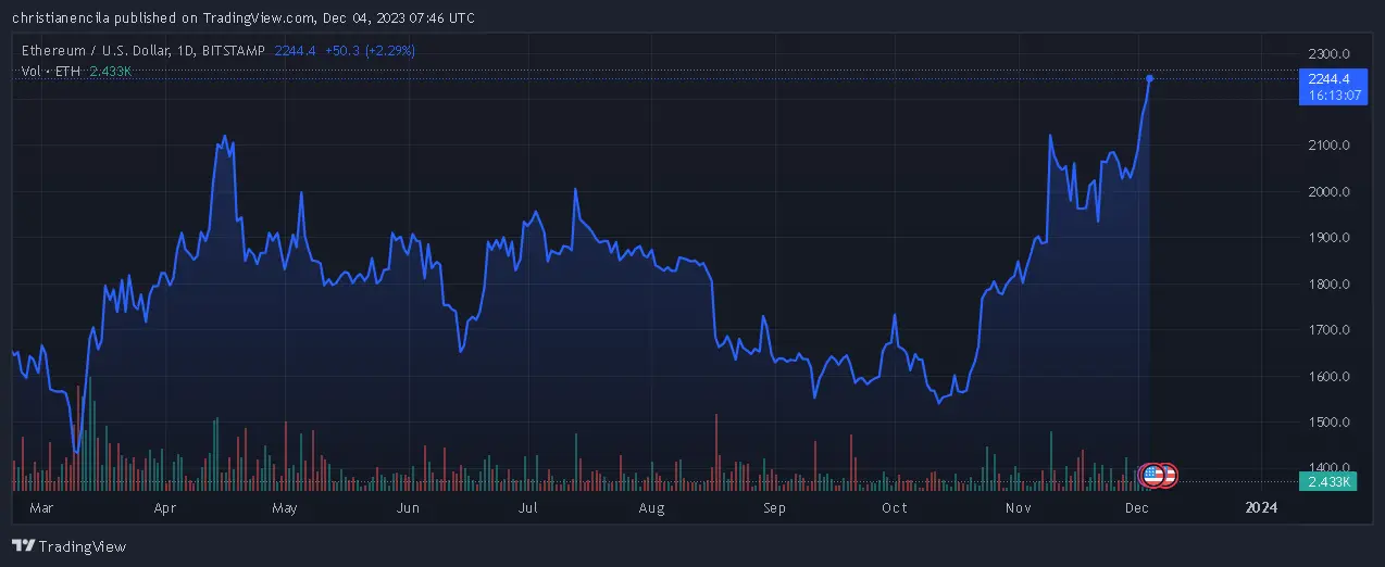 The price of Ethereum (ETH) has risen sharply today, hitting a new 2023 high of $2,250 as the cryptocurrency market continued to trend higher toward a successful year-end.