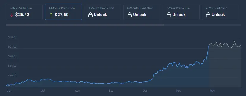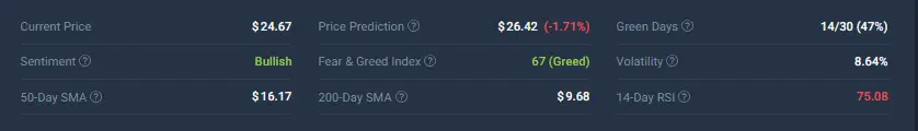 A bullish continuation might see buyers target prices above $30. A bearish turn in tandem with a wider market decline may signal a possible decline to $20–$18 range support.