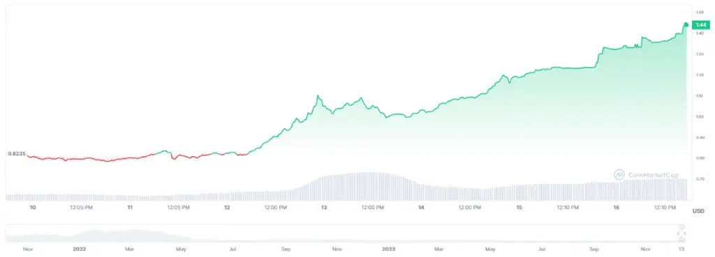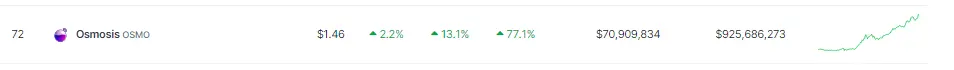 At the time of writing, OSMO was trading at $1.46, up 14.1% in the last 24 hours, and tallied a commanding 76.3% rally in the last seven days, data from Coingecko shows.