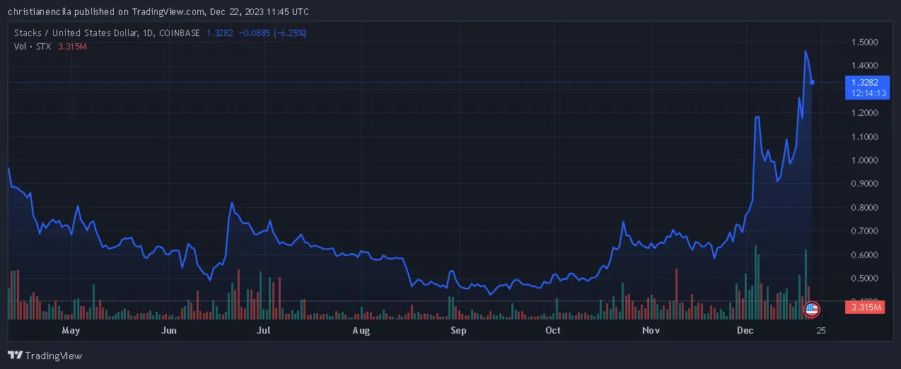 STXUSD currently trading at $1.3283 territory. Chart: TradingView.com
