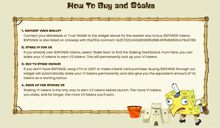Investors who buy and stake $SPONGE from the official website will get an equivalent amount of V2 tokens in their wallet, in addition to bonus tokens.