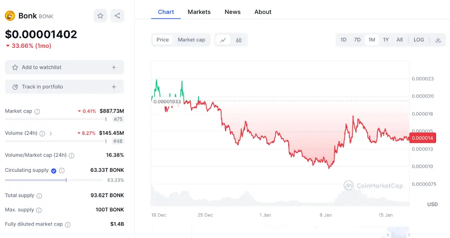 $BONK’s recovery run is coming to a halt. Despite the massive social media presence of the project, the meme coin has been struggling to prove its worth over the last few days. To give a better perspective, $BONK has slipped down 59% since it claimed a new all-time high on Dec 15, 2023.